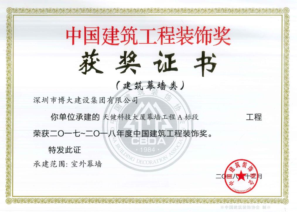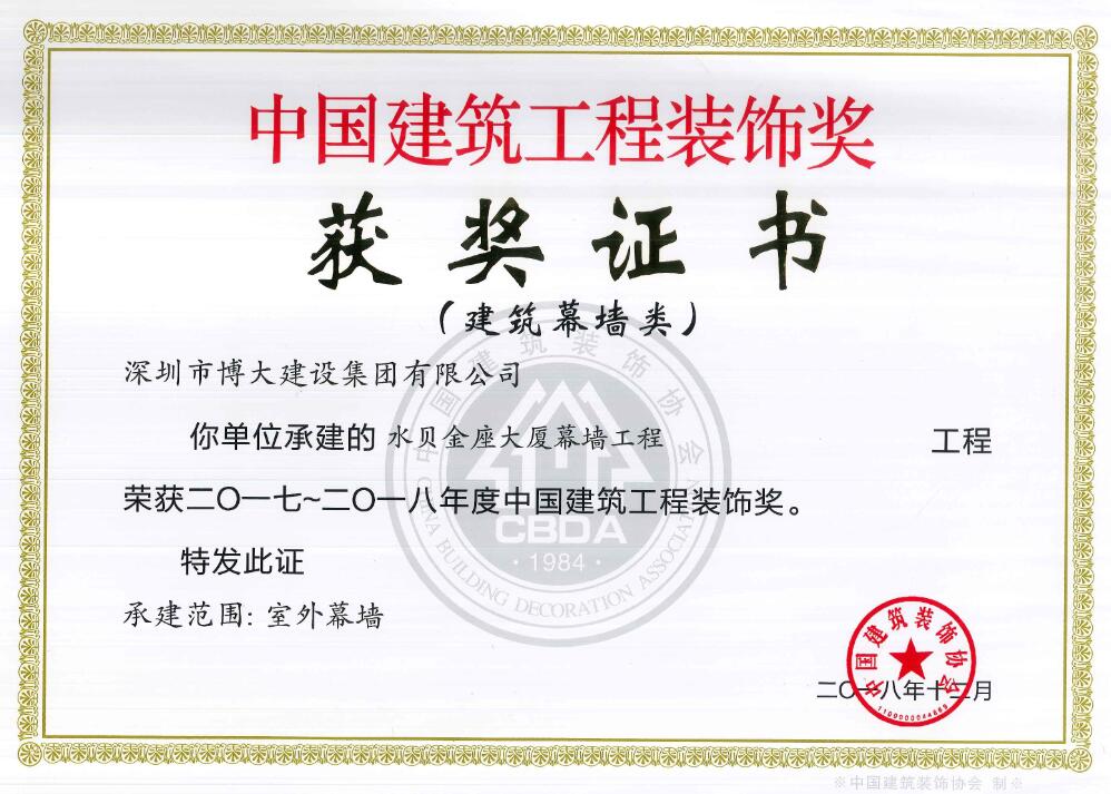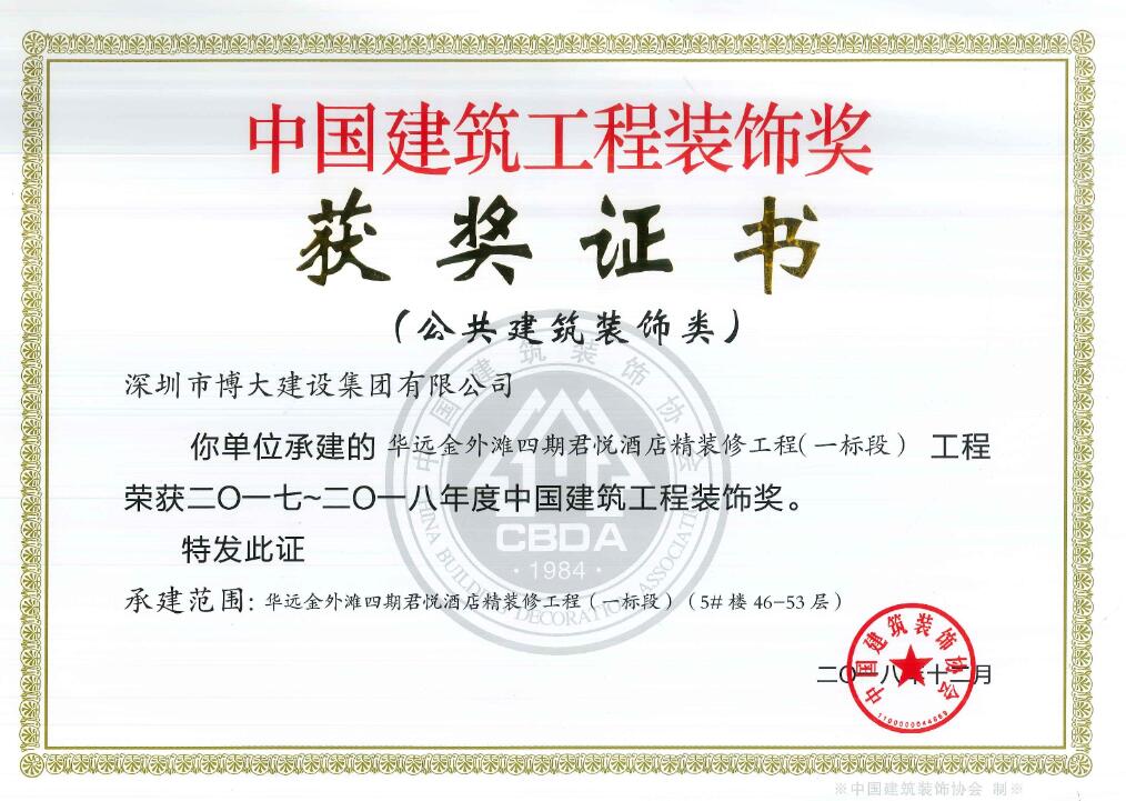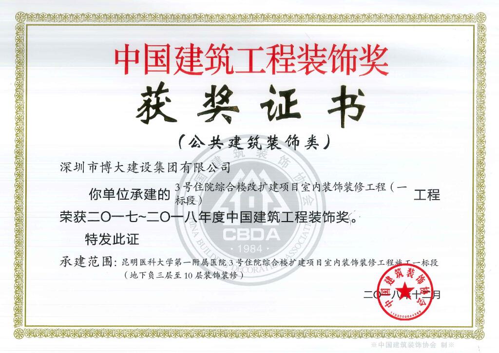 博大建設(shè)集團(tuán)承建的昆明醫(yī)科大學(xué)第一附屬醫(yī)院3號(hào)樓、華遠(yuǎn)金外灘四期君悅酒店、綠景虹灣裙樓商業(yè)公共部分、水貝金座大廈幕墻工程、天健科技大廈幕墻工程等5個(gè)經(jīng)典工程以卓越品質(zhì)榮獲中國建筑工程裝飾獎(jiǎng)。