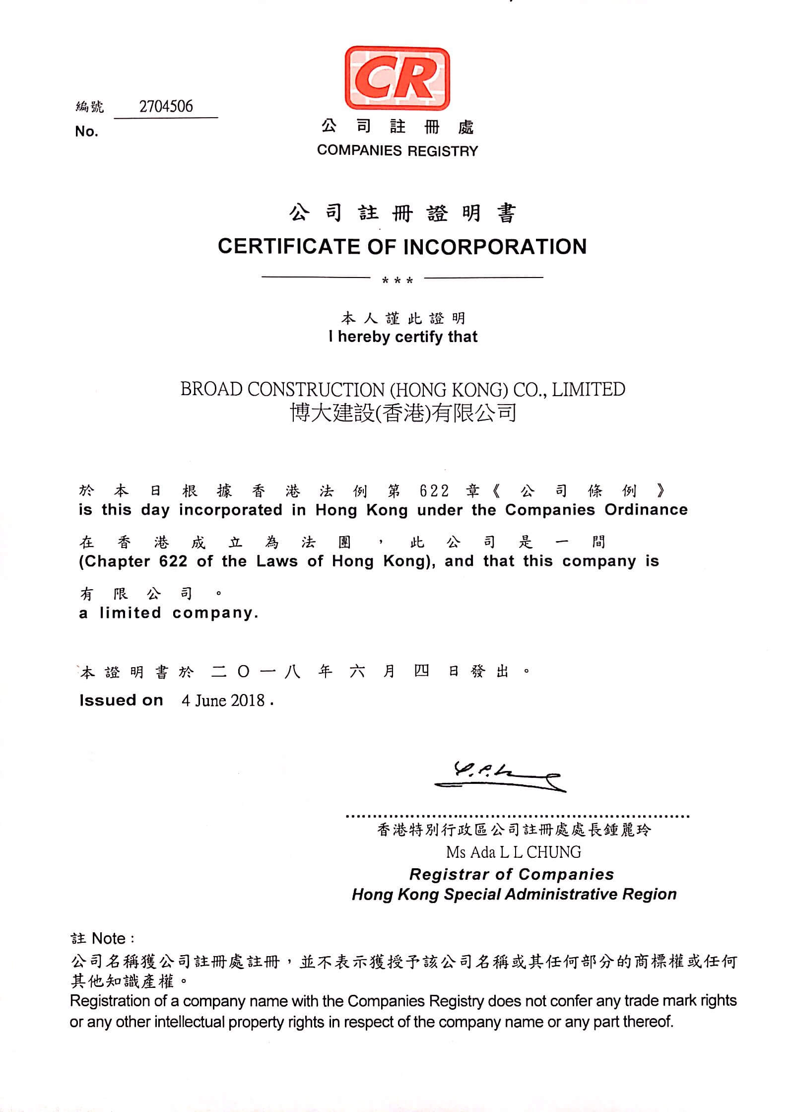 6月4日,博大建設集團香港公司正式注冊成立,博大建設集團總部設在深圳,加上之前成立的澳門公司,初步完成粵港澳大灣區(qū)的戰(zhàn)略布局。