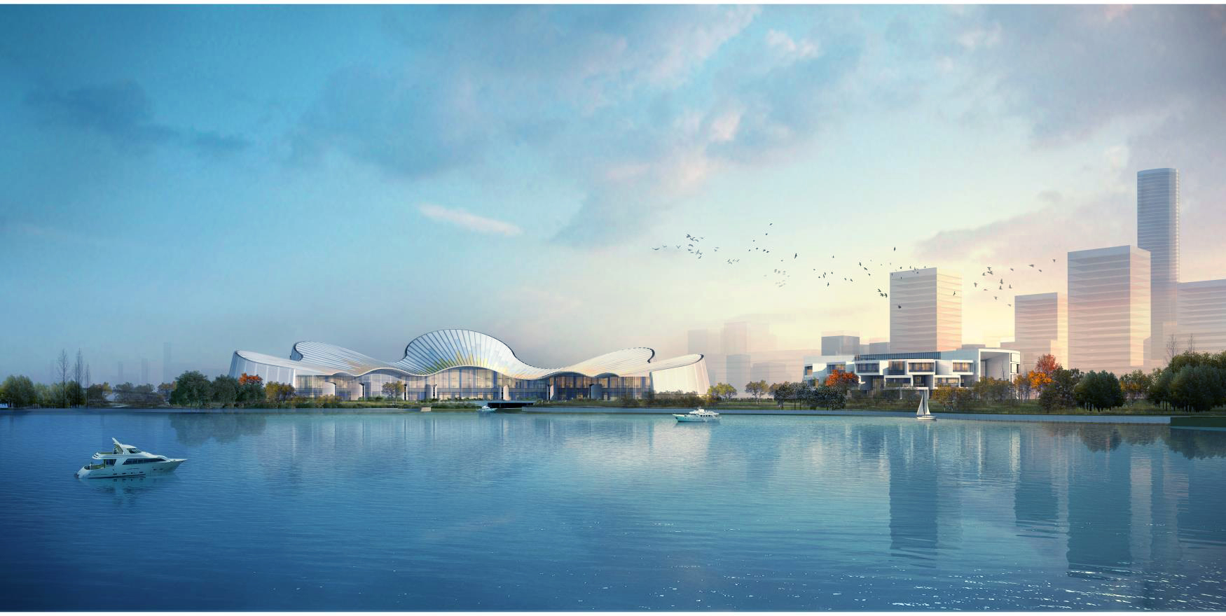 城市一側(cè),有著柔和曲線,潔白的舞臺(tái)塔,仿佛是一片輕盈的祥云,駐足在紫瑯湖畔,引導(dǎo)著行人來到湖邊,向他們展示優(yōu)美動(dòng)人的湖岸景觀。