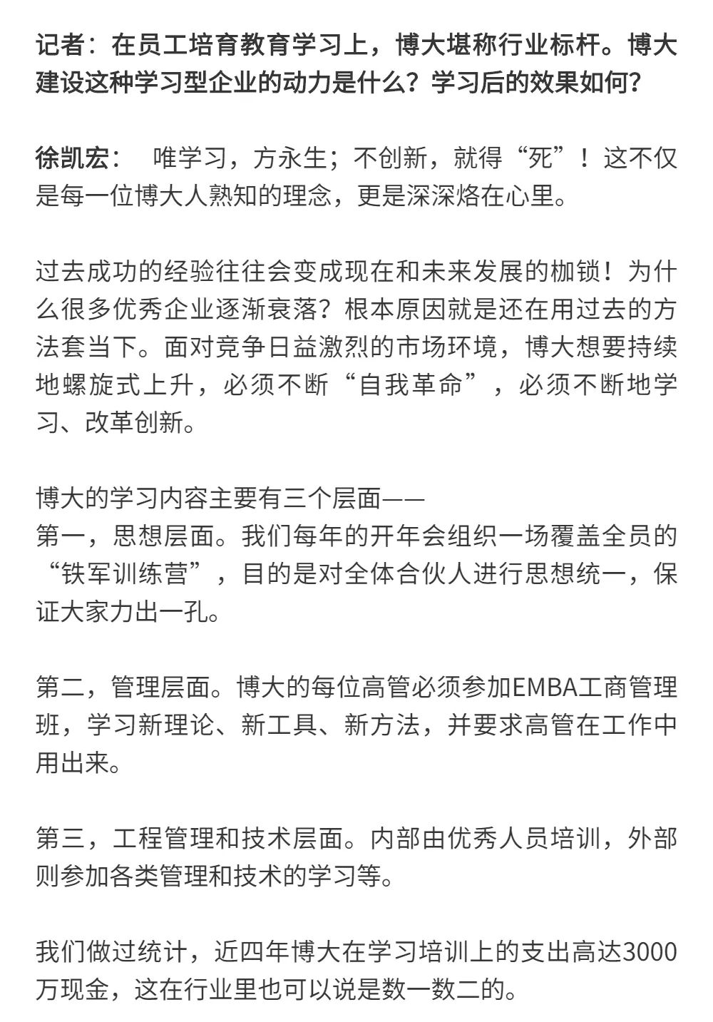 博大以雷霆之勢迅速崛起,吸引了行業的高度關注,行業權威媒體《中華建筑報》數次深入博大一線調研走訪,并對創始人徐凱宏先生進行了坦誠的訪談,以探討和總結博大發展的秘籍,并寫就了《進擊的博大:從高速到高質量的創新逆襲》和《對話徐凱宏 | 博大正沿著高質量發展道路堅定前行》兩篇文章。